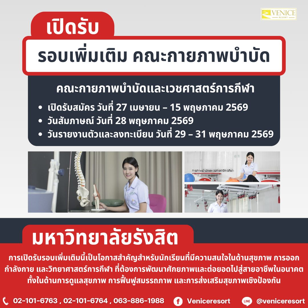 📢 โอกาสดีสำหรับสายสุขภาพและกีฬา! เรียนต่อพร้อมวางแผนที่พักใกล้มหาวิทยาลัยสำหรับน้อง ๆ ที่กำลังมองหาที่เรียนต่อด้านสุขภาพและการกีฬา ตอนนี้ คณะกายภาพบำบัดและเวชศาสตร์การกีฬา ม.รังสิต ได้เปิดรับสมัครรอบเพิ่มเติมแล้ว ถือเป็นอีกหนึ่งโอกาสสำคัญในการก้าวสู่สายอาชีพที่กำลังเป็นที่ต้องการในอนาคต