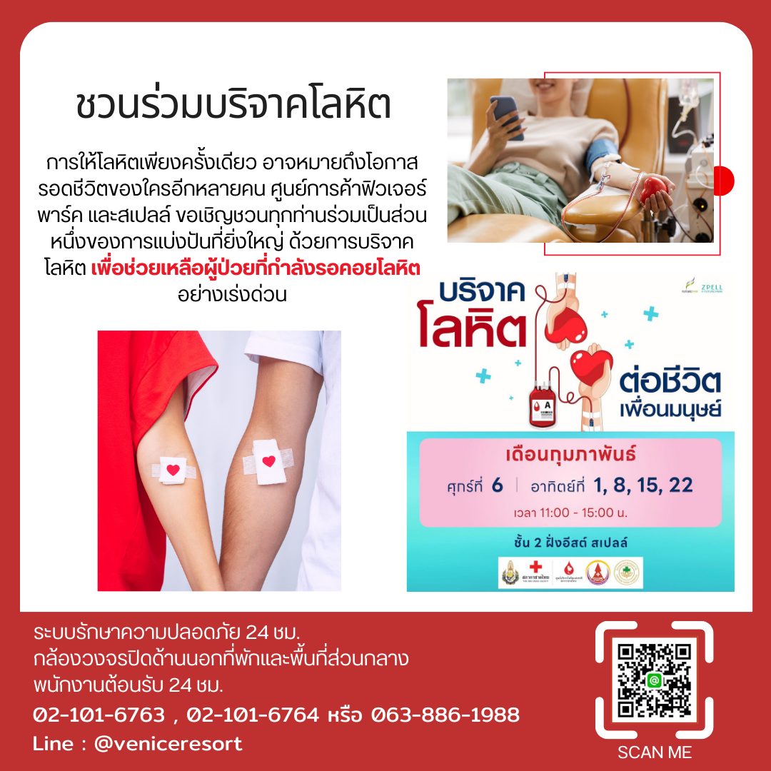 ร่วมส่งต่อพลังแห่งการให้ ที่ศูนย์การค้าฟิวเจอร์พาร์ค และสเปลล์ ศูนย์การค้าฟิวเจอร์พาร์ค และสเปลล์ ขอเชิญชวนทุกคนร่วมเป็นส่วนหนึ่งของการช่วยเหลือสังคม ด้วยการ บริจาคโลหิต เพื่อส่งต่อชีวิตให้กับผู้ป่วยที่กำลังรอคอยโลหิตของคุณ เพราะการให้เพียงเล็กน้อย ใช้เวลาไม่นาน แต่สามารถสร้างคุณค่าและความหวังได้อย่างมหาศาล